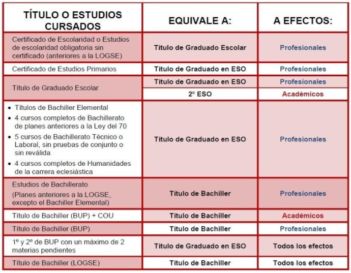 Si quieres saber a qué equivalen los estudios que cursaste hace tiempo, consulta la siguiente tabla: